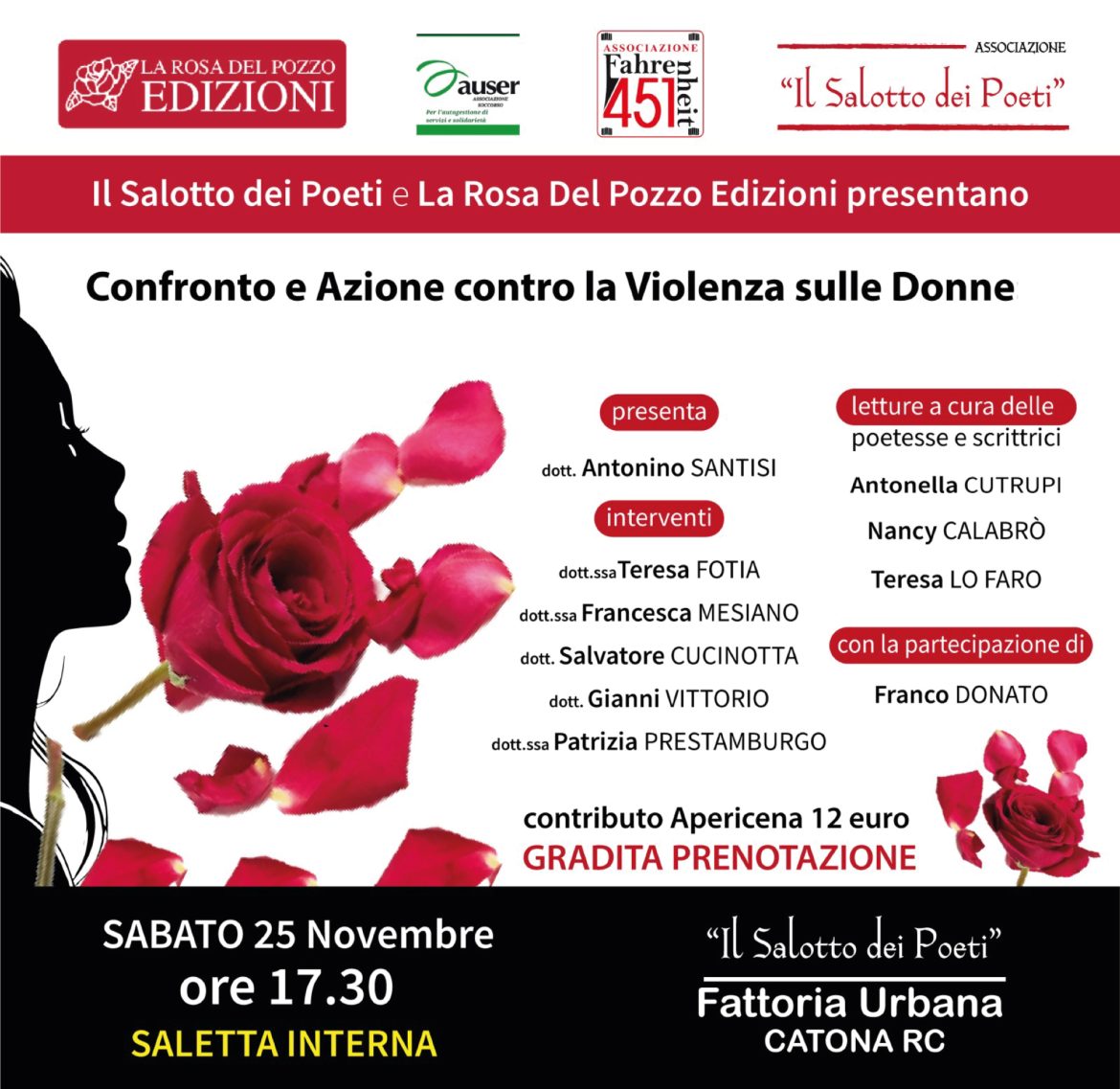 Sabato 25 Novembre alle 17.30, in occasione della Giornata contro la violenza sulle Donne, si terrà un incontro con La Rosa Del Pozzo presso la Fattoria Urbana di Catona. Ci impegniamo a promuovere un mondo senza violenza sulle donne e vorremmo condividere questo importante momento. Durante questa serata significativa, affronteremo il tema cruciale della lotta contro la violenza sulle donne attraverso conversazioni coinvolgenti che mirano a sensibilizzare e ad agire per un cambiamento positivo. Presenterà la serata il dott. Antonino Santisi, pres. de “Il Salotto dei Poeti”. Interverranno la dott.ssa Teresa Fotia, la dott.ssa Francesca Mesiano, il dott. Salvatore Cucinotta ed il dott. Gianni Vittorio dell’Associazione Fahrenheit451 e la dott.ssa Patrizia Prestamburgo. La serata sarà accompagnata dalle letture delle poetesse Antonella Cutrupi, Nancy Calabrò e Teresa Lo Faro con la partecipazione di Franco Donato.