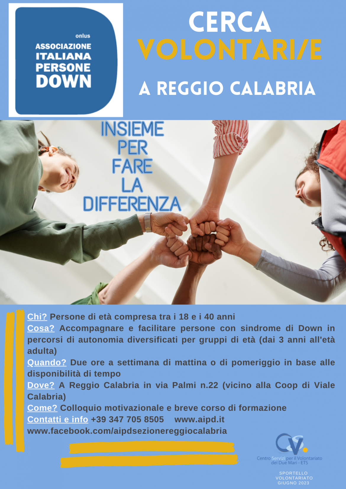 La sezione reggina di AIPD – Associazione Italiana Persone con sindrome di Down, impegnata da anni nella promozione di percorsi di autonomia e di inserimento sociale per minori e adulti con sindrome di Down, cerca nuove volontarie e nuovi volontari da coinvolgere nelle attività associative.