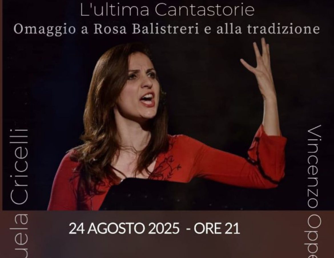Il 24 agosto 2025 alle 21:00 il borgo sulle colline pellaresi si accenderà di musica e racconti con lo spettacolo L’ultima cantastorie. Un recital che intreccia parole e canzoni per riportare in vita la voce e l’anima di Rosa Balistreri, icona della musica popolare del Sud Italia. Sarà la cantante e attrice Manuela Cricelli ad interpretare, accompagnata alla chitarra da Vincenzo Oppedisano, il percorso artistico ed esistenziale dell’indimenticabile Rosa.