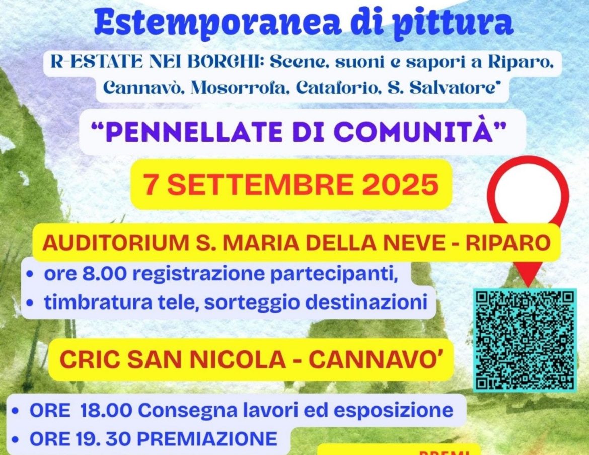 Domenica 7 settembre 2025 si terrà “Pennellate di Comunità”, il concorso di pittura estemporanea che animerà Cataforio, San Salvatore, Mosorrofa, Cannavò e Riparo di Cannavò, trasformandoli in luoghi di bellezza condivisa e creatività diffusa.