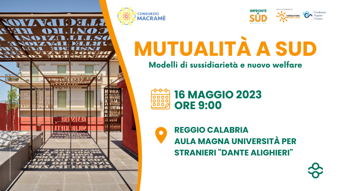 Martedì 16 maggio, dalle 09:00 alle 13:00, presso l’Aula Magna dell’Università per Stranieri “Dante Alighieri”, si svolgerà l’evento “Mutualità a Sud – Modelli di sussidiarietà e nuovo welfare”, promosso dal Consorzio Macramè. L’appuntamento si svolgerà alla presenza del Presidente – Paolo Morerio – e del Direttore – Carmine Guanci – della Fondazione Peppino Vismara e con le conclusioni affidate alla vicepresidente nazionale di Legacoopsociali, Marta Battioni.