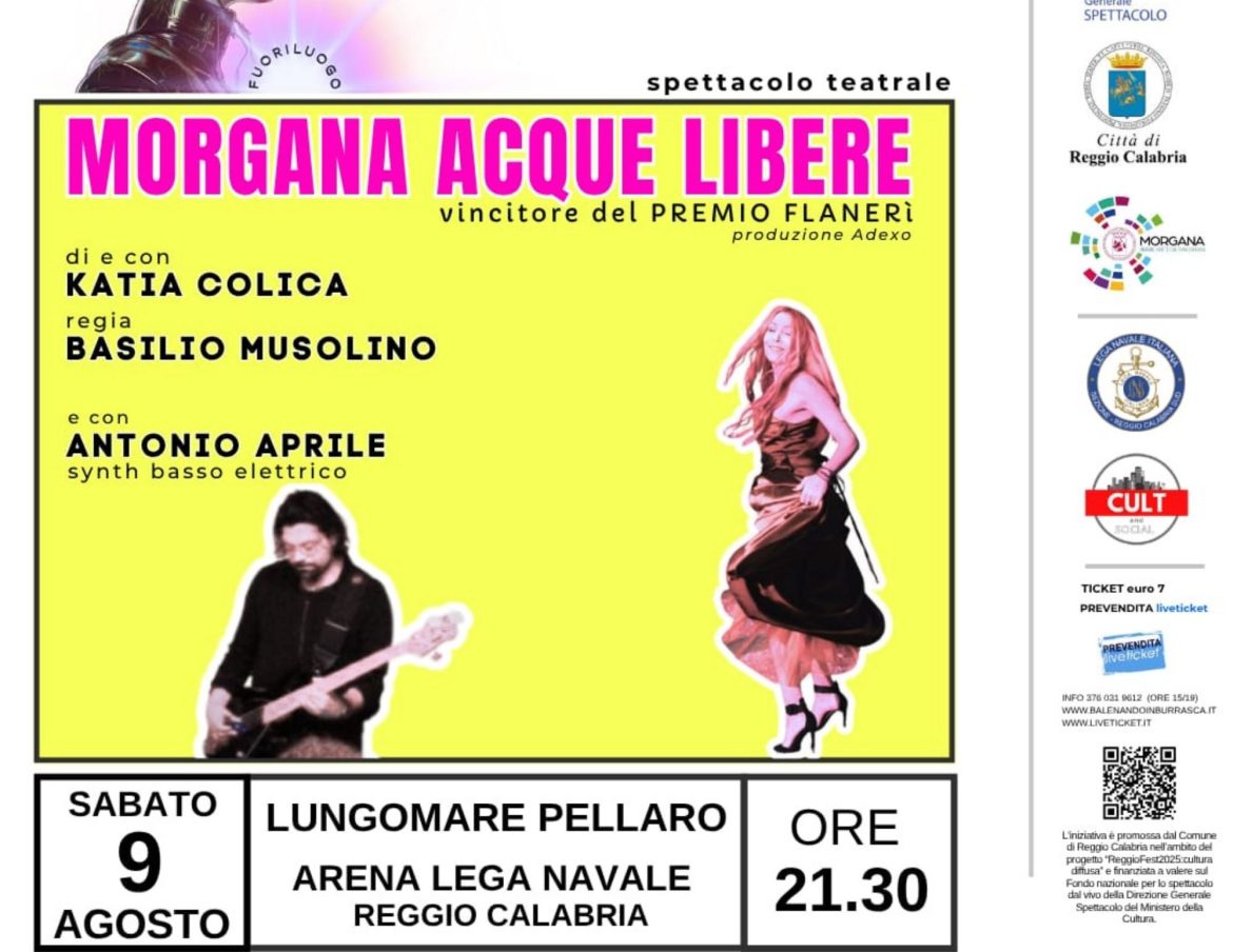 Oggi, alle ore 21:30, sul lungomare di Pellaro, andrà in scena “Morgana, acque libere”, spettacolo di e con Katia Colica e Antonio Aprile (basso, synth & sounds), con la regia di Basilio Musolino.