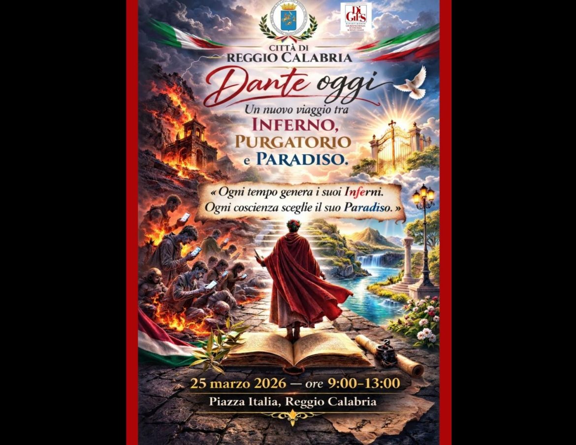 Domani, mercoledì 25 marzo 2026, dalle ore 9:00 alle ore 13:00, si svolgerà a Piazza Italia l’iniziativa Dante oggi: Un nuovo viaggio tra Inferno, Purgatorio e Paradiso.