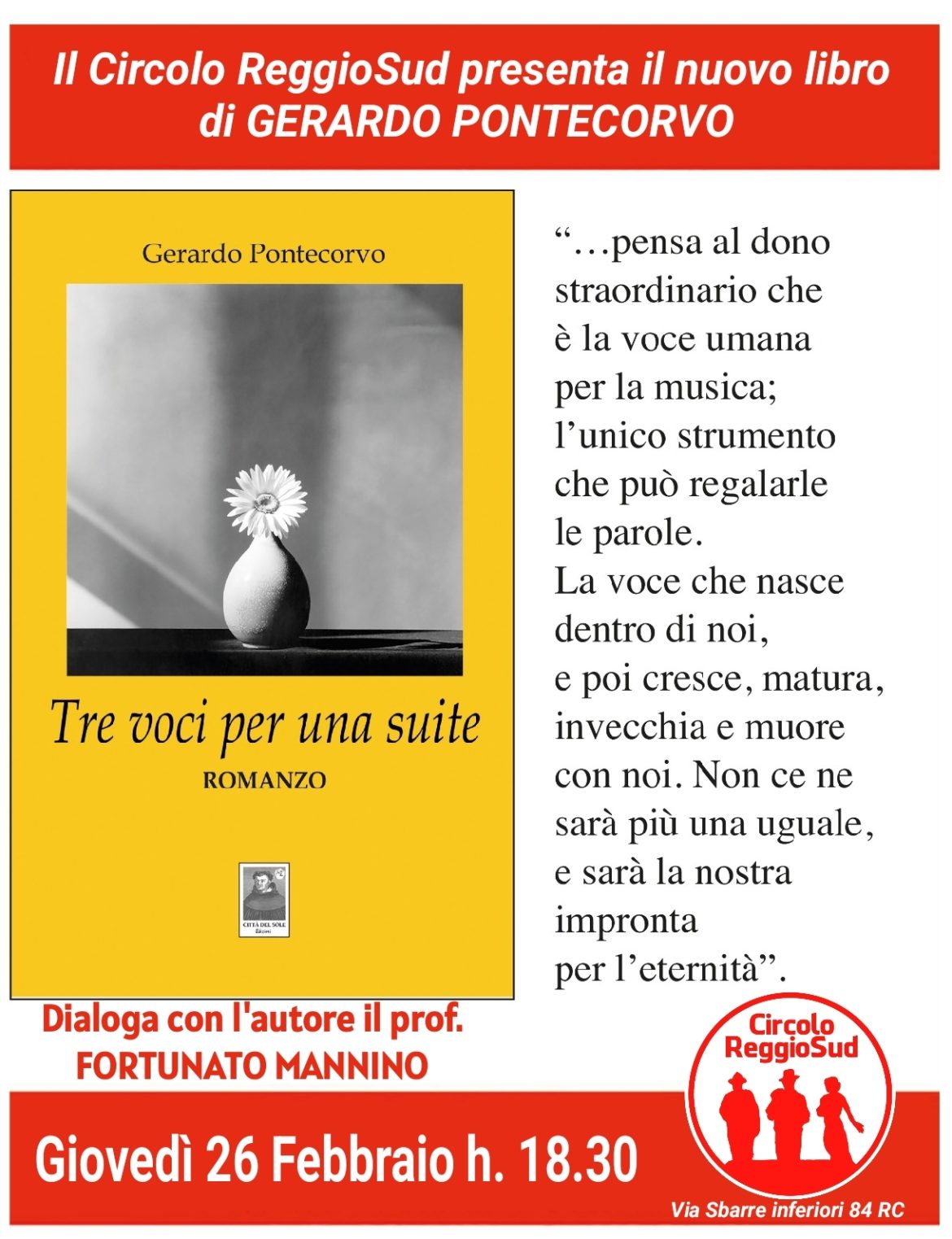 L’appuntamento è fissato per giovedì 26 febbraio alle ore 17:15, presso la Sala Giuffrè della Villetta della Biblioteca “Pietro De Nava”.