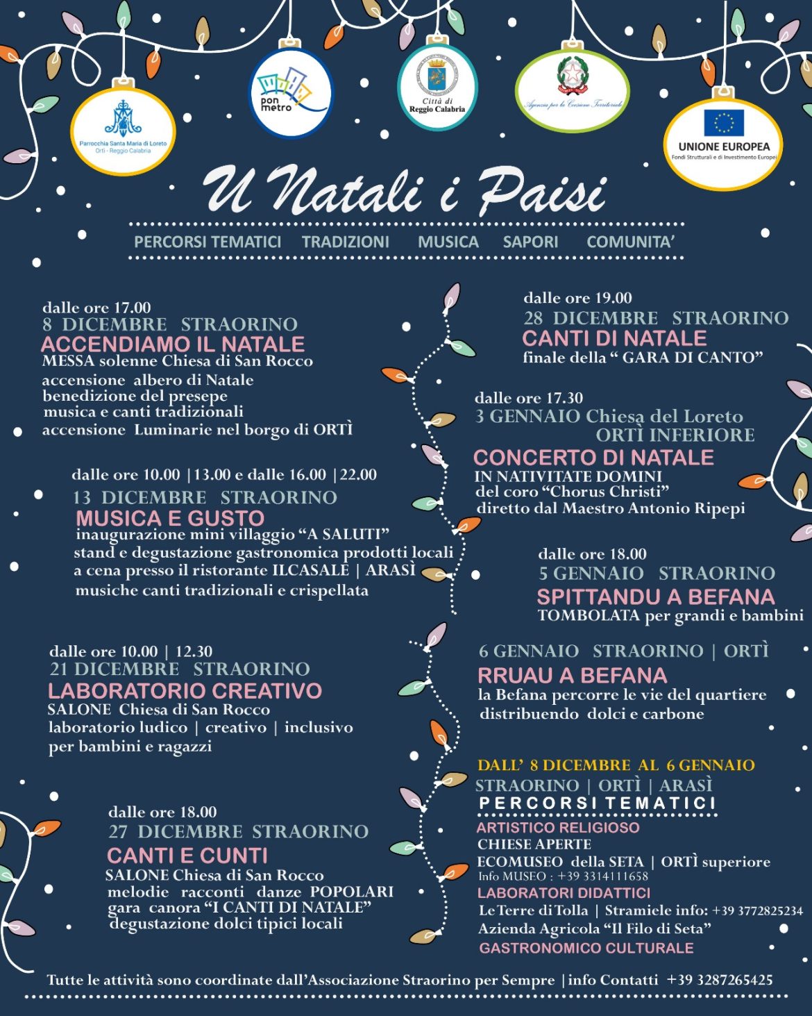 La Parrocchia di Santa Maria di Loreto Ortì, insieme all’Associazione Straorino per Sempre, presenta “U Natali i Paisi“, una manifestazione che unisce percorsi tematici, tradizioni, musica, sapori e comunità, con l’obiettivo di valorizzare il territorio e le sue radici storiche. Il programma, ricco e variegato, propone un viaggio immersivo nelle tradizioni natalizie dei nostri borghi.