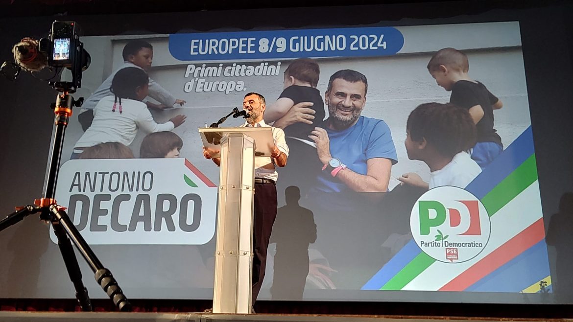 Prende quindi la parola Decaro, grande ospite della serata, dichiarandosi di essere contento di essere a Reggio e motiva sulla frase scelta come slogan per questa campagna elettorale “Primi cittadini d’Europa”, a conferma della decisione, come obiettivo centrale della sua missione: portare la sua esperienza di Sindaco in Europa perchè, secondo la sua prospettiva è politico di prossimità, la figura più vicina ai problemi, alle difficoltà della propria gente, ma anche quelli più vicini ai sogni alle aspirazioni degli stessi, doppia valenza contrapposta, quindi anche propositiva, affinchè l’Europa arrivi ad avere un’unica voce, marcando che la massima istituzione politica europea debba ispirarsi al manifesto a Ventotene su solidarietà, accoglienza, pace, fraternità.