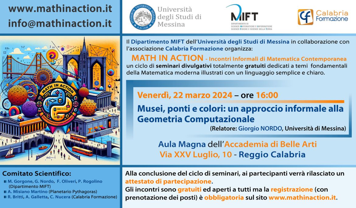 È con grande entusiasmo che ricordiamo a tutti gli interessati che il seminario “Ponti, Musei e Colori: un approccio informale alla Geometria Computazionale”, primo appuntamento della serie “Math in Action”, si terrà oggi, venerdì 22 marzo, alle ore 16:00 presso l’Aula Magna dell’Accademia di Belle Arti in via XXV Luglio 10, Reggio Calabria.