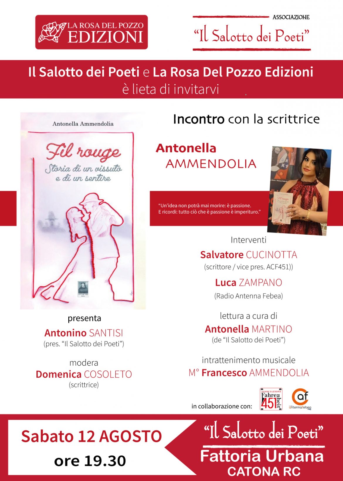 Al Salotto dei Poeti de “La Rosa del Pozzo Edizioni” nella splendida cornice della Fattoria Urbana di Catona, si terrà Sabato 12 Agosto alle 19.30 l’incontro con la giovane scrittrice reggina Antonella Ammendolia con il romanzo “Fil Rouge – Storia di un vissuto e di un sentire.“.