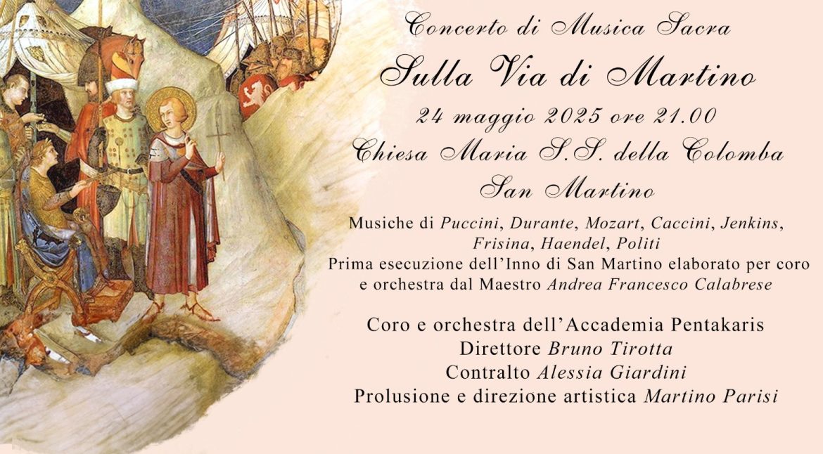 Il concerto vedrà la prima esecuzione dell’Inno di San Martino, elaborato per coro e orchestra dal Maestro Andrea Francesco Calabrese e l’esibizione del coro e dell’orchestra Pentakàris. Il direttore sarà Bruno Tirotta, mentre il contralto sarà Alessia Giardini, su musiche sacre di Puccini, Mozart, Durante, Caccini, Jenkins, Frisina, Haendel e Politi.