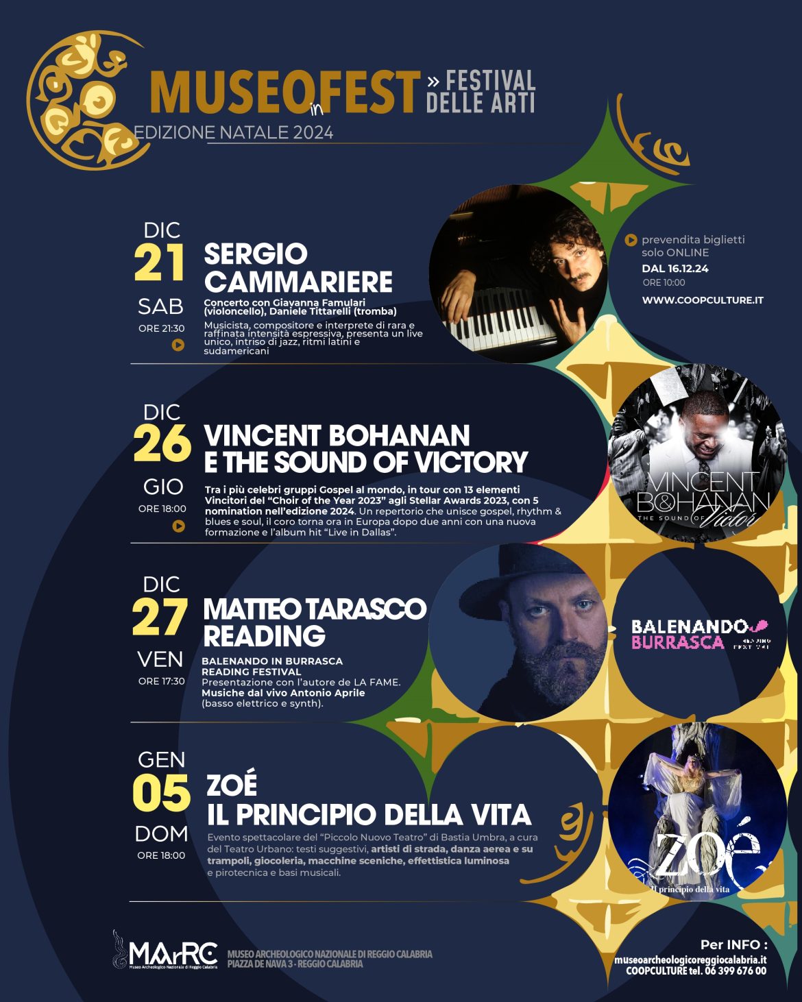 Con la direzione artistica di Ruggero Pegna, in Piazza Orsi, la sala interna al Museo capace di ospitare fino a 150 fortunati spettatori, il 21 dicembre alle ore 21:00, davanti ai Bronzi terrà uno speciale concerto Sergio Cammariere. Il grande cantautore e pianista sarà accompagnato da Giovanna Famulari al violoncello e Daniele Tittarelli al sassofono.