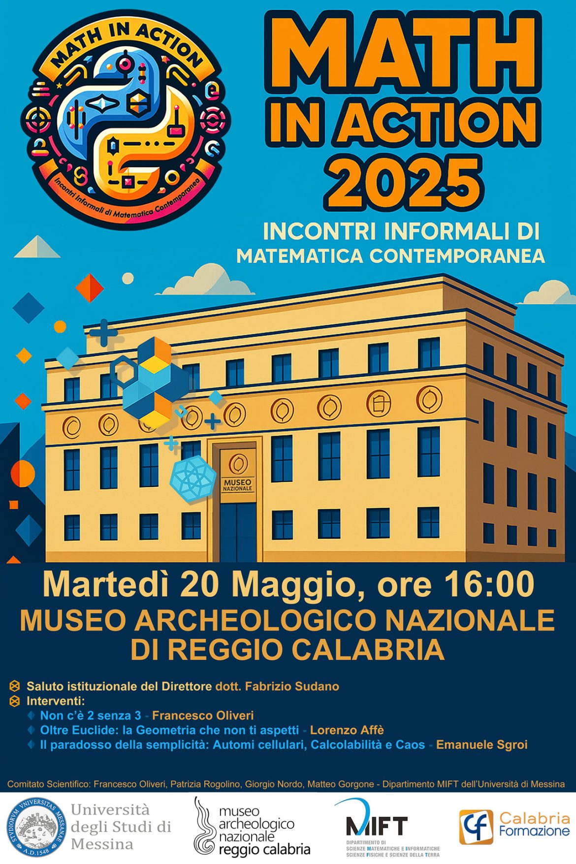 Manca ormai pochissimo all’inizio di Math in Action 2025, la seconda edizione dell’evento di divulgazione scientifica che celebra la matematica contemporanea in una delle location più suggestive del Mediterraneo: la terrazza panoramica del MarRC di Reggio Calabria.